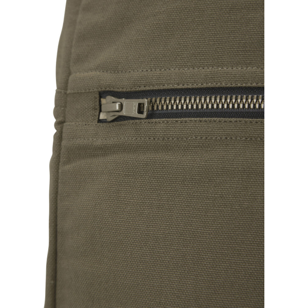 Sac à dos en toile avec poche avant visible. Fermetures éclaire YKK en métal de couleur bronze avec une finition vintage. Poche intérieure. Sangles et poignées de transport solides et réglables. Doublure intérieure noire pour les deux coloris.