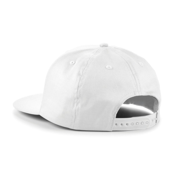 100% coton Twill. Visière plate. Ajustable par réglette plastique rétro Snapback. Étiquette Tearaway pour faciliter le changement de marque.
