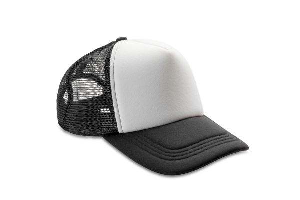 100% rembourrage polyester. 5 panneaux : 4 en maille filet et 1 en tissu. Panneau frontal blanc et maille de couleur contrastée. Ajustable par réglette plastique rétro Snapback. Visière semi-courb