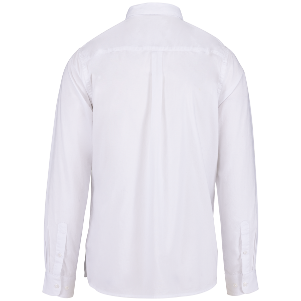 100% coton biologique. Coton peigné. Coupe droite. Patte de boutonnage classique avec boutons effet nacré. Empiècement dos « pli rond » décontracté. Patte de manche en pointe « capucin » bout
