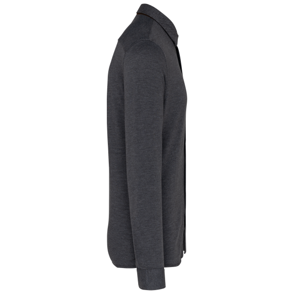 68% coton / 32% polyester. Maille jacquard. Pied de col en suédine contrasté. Look moderne. Matière confortable et douce. Patte de boutonnage classique avec boutons imitation nacre. Poignets régla