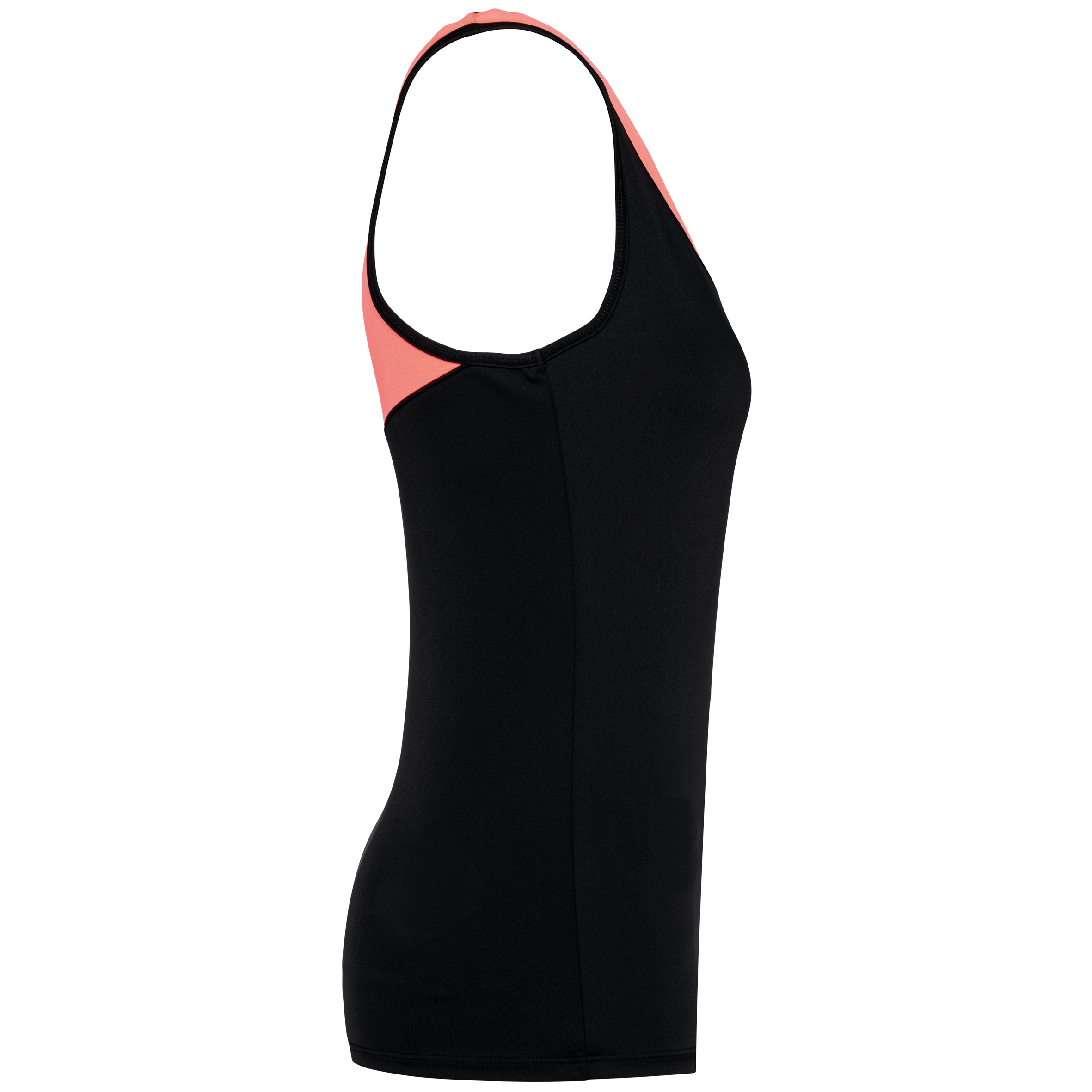 80% polyester / 20% élasthanne. Inserts contrastés : 90% polyester / 10% élasthanne. Tissu maille jersey. Coupe cintrée. Encolure profonde. Finition biais sur encolure et emmanchures et double aig