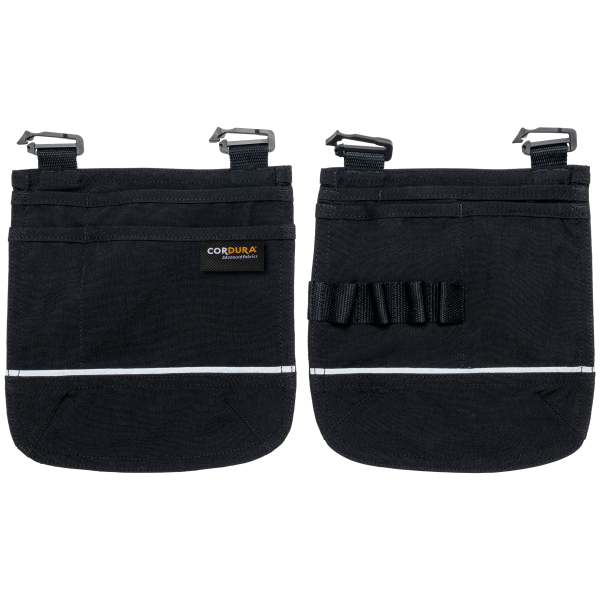 Cordura®. Vendu par paires. 2 poches outils en Cordura® avec piping silver, développées pour s'accrocher sur les passants d'un pantalon. Les poches s'accrochent avec un système de clips. L'espace