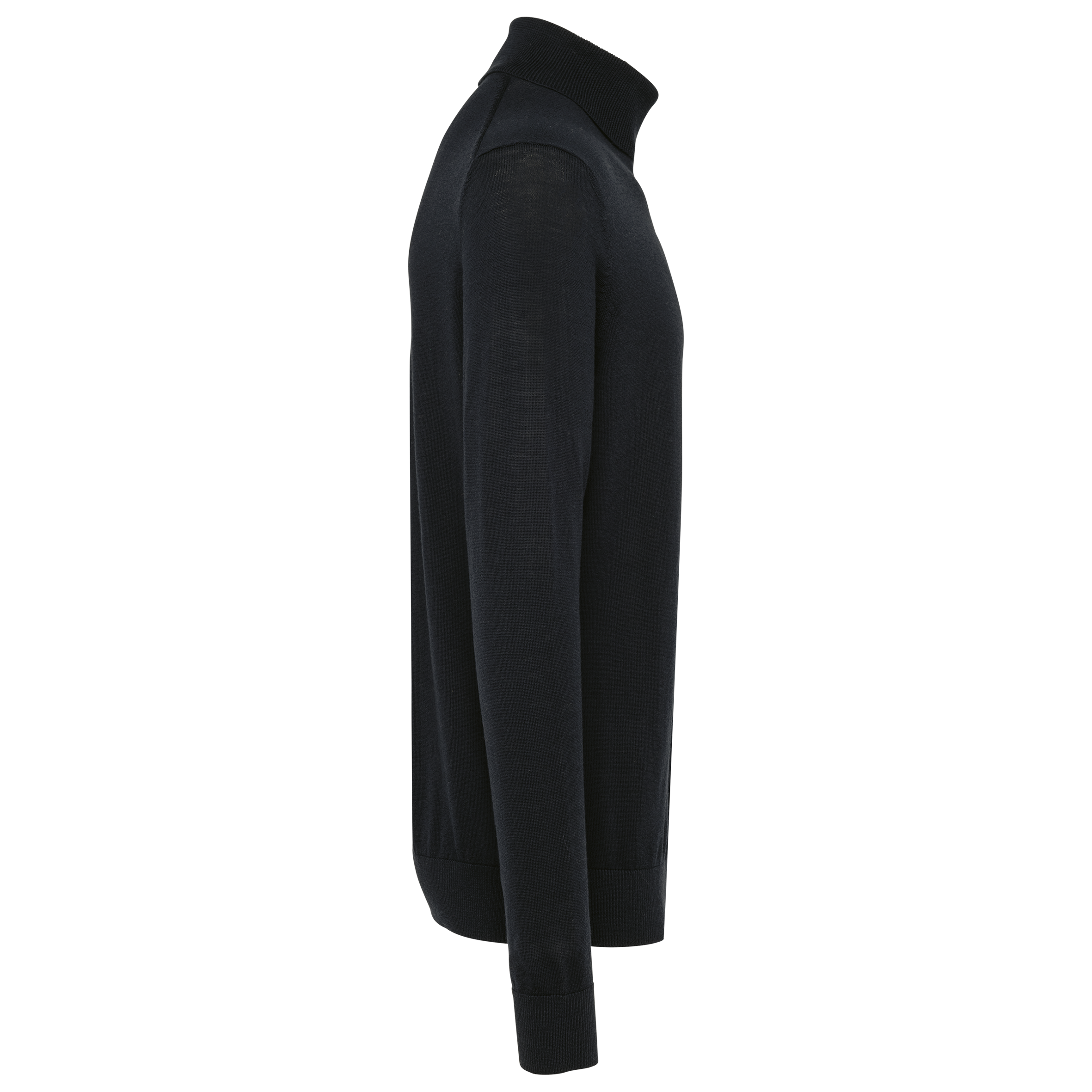 100% Mérinos. Laine extra-fine peignée. Jauge 14. Fully-fashioned : tricoté dans la forme et assemblé sur machine de remaillage. Col roulé, poignets et bas du vêtement rib 1 x 1.