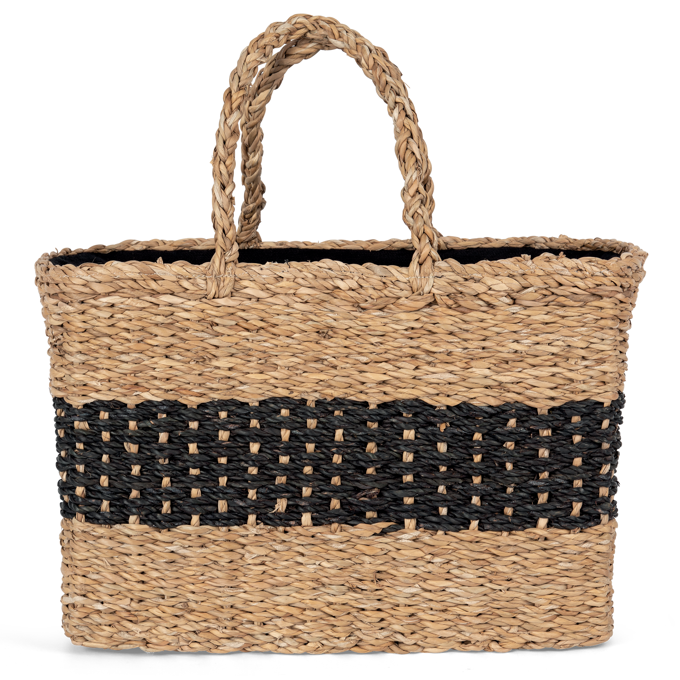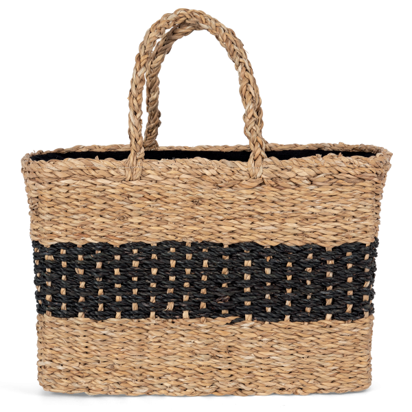 100% jonc de mer. ONE SIZE (19 x 38cm x 27cm). Capacité : 21L. Ce produit est tressé à la main à partir de fibres végétales de jonc de mer. Doublure intérieure couleur Black en fil cyclo conçu