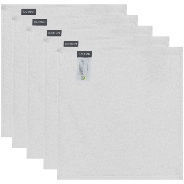 100% coton. Maille bouclette. Lot de 5 serviettes. Dimensions : 30 x 30 cm. Etiquettes de marque détachables.