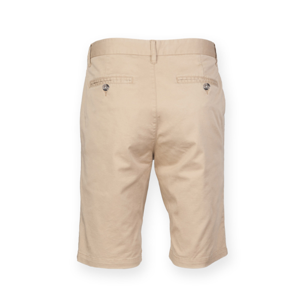 97% coton / 3% élasthanne. Short Chino avec poches avant inclinées et 2 poches passepoilées à l'arrière. Passants pour ceinture. Fermeture YKK. Ourlets plats. Sans étiquette pour une personnalis