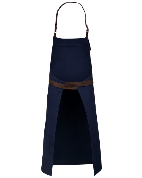 100% coton. Tissu canvas. Boucle de réglage en métal avec œillets au niveau du cou pour ajuster la longueur du tablier. Sangles d'attache en tissu fantaisie enduit. Grande poche devant en deux comp