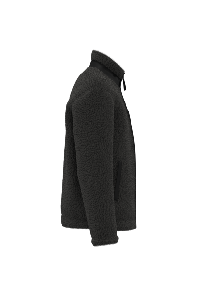 100% polyester recyclé post-consumer. Matière sherpa double face avec polaire intérieure ton sur ton. Poche poitrine côté cœur et poche passepoilée côté en matière ripstop contrastée sur le